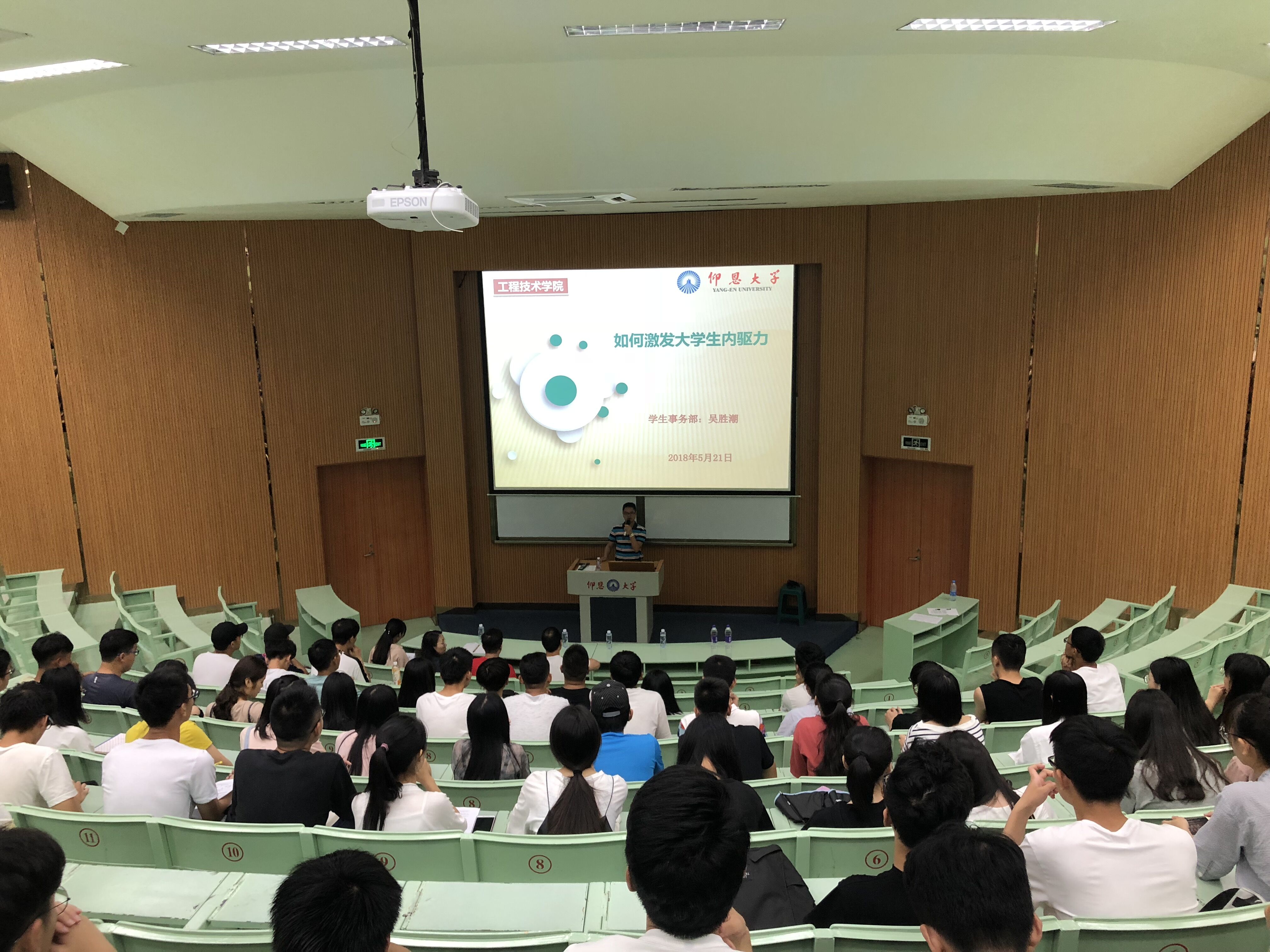 吴胜潮主任以如何激发自身内驱力为主题展开讲座,对我院近阶段的学风改善给与了肯定,学风的改善离不开教师以及学院学生骨干的付出。以个别案例指出了当代大学生期望值不高,目标不明确,沉迷于游戏等一些现状。以罗格斯大学,麻省理工学院等美国高校例子进行对比,结合自己的经历与学生分享学生时代的学习生活。并对学生干部们提出几点建议首先要有居安思危的忧患意识,做好职业生涯规划,提高自身内驱力,才能时刻准备应对变化。其次学生干部应树立正确的自身价值观,严格要求自己,认真履行职责,发挥带头作用,注重自身修养提高工作效率,传帮带动下一届的学生。最后用“常怀感恩之心,心有敬畏二字,” 表达了对大家的期望,期待着各部门在学生工作方面取得长足进步。