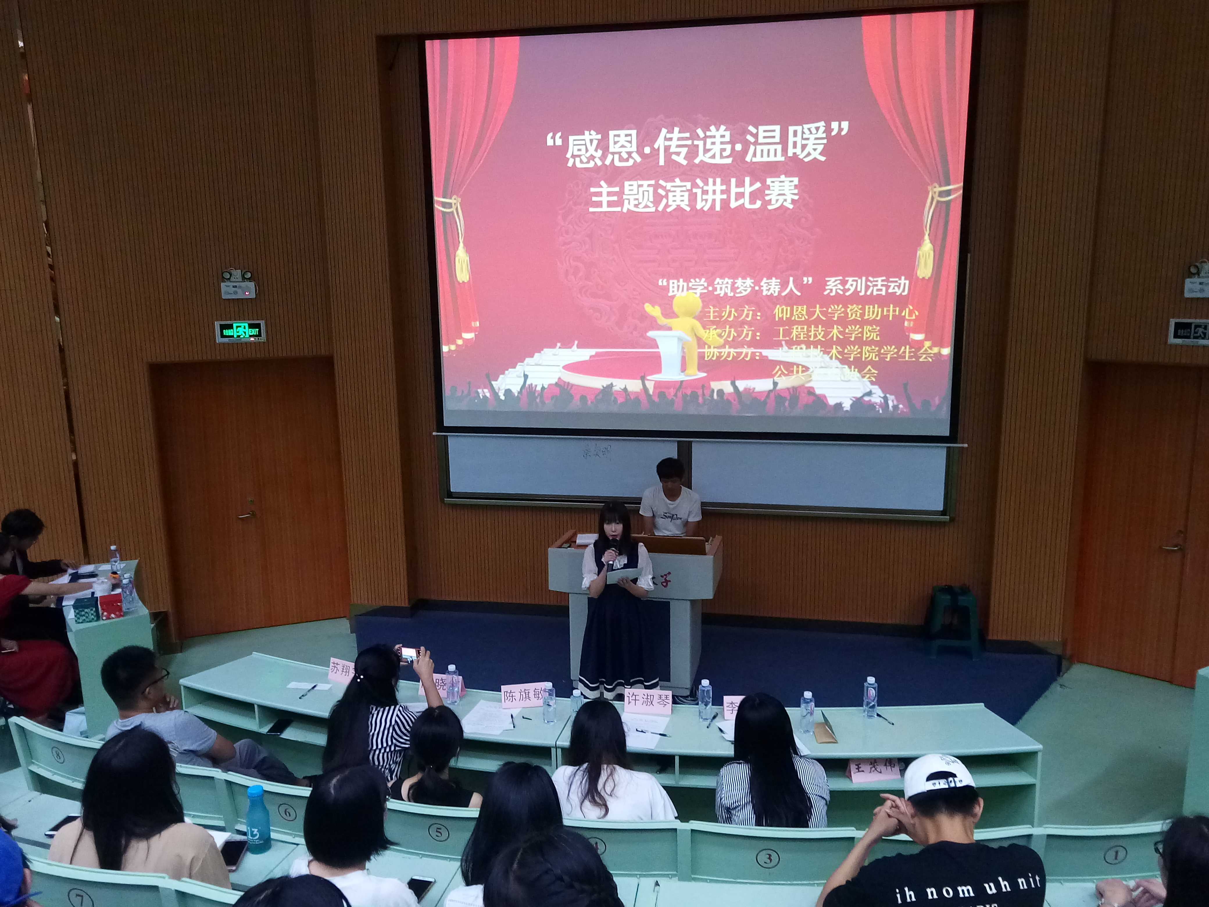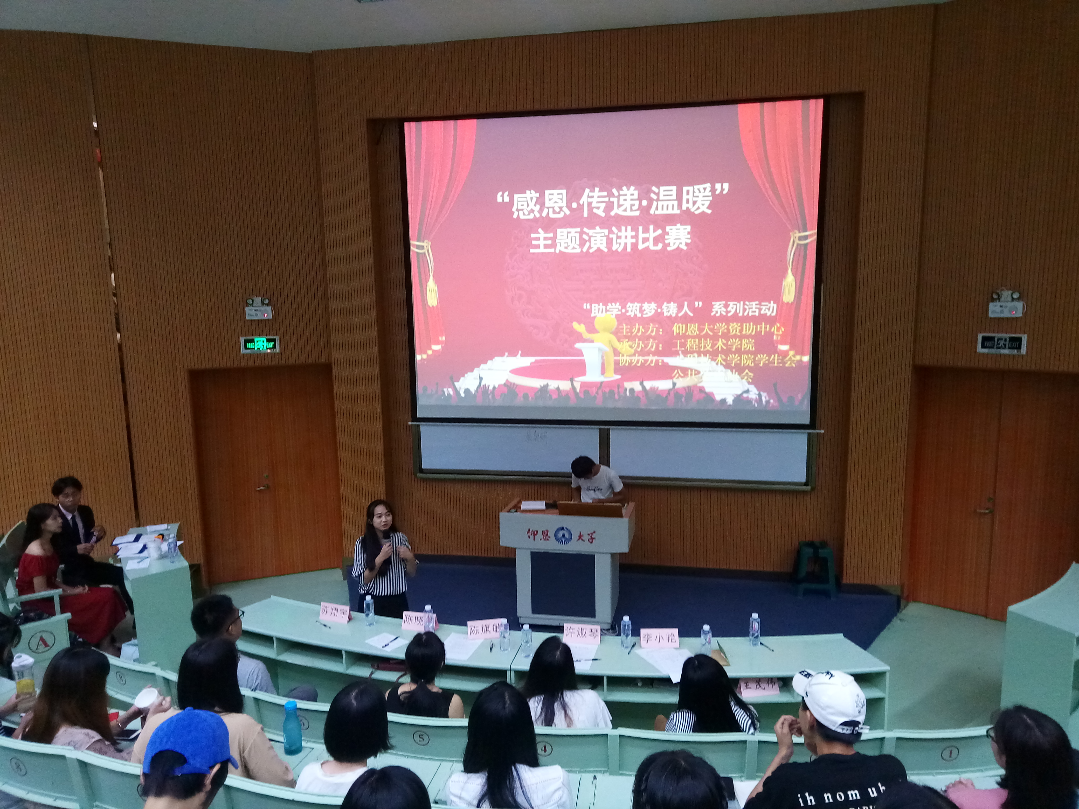 6月6日晚上7点半yl6809永利官网集团在旧区和昌乐之讲堂举行了“助学·筑梦· 铸人” 系列演讲活之“感恩.传递.温暖”主题演讲比赛。出席此次活动的嘉宾有学生会指导老师陈晓红、院团委书记许淑琴、学务秘书陈旗敏、教师李小艳。