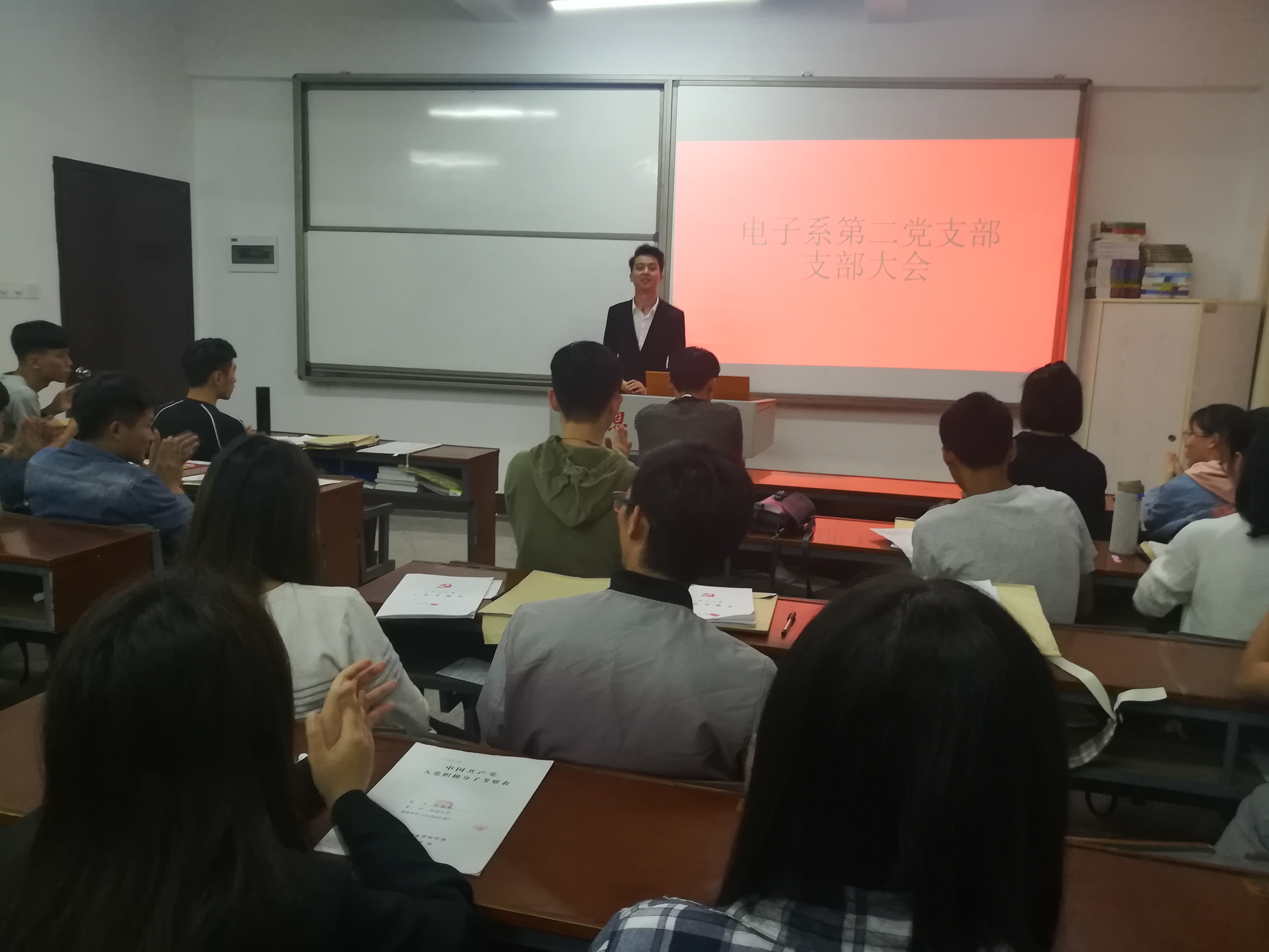 2018年12月4日晚七点半,电子系第二党支部在共和教学楼302召开支部大会。本次会议由党支部书记林斯玲主持,出席的人员有组织委员翁彬锋,宣传委员王依依以及电子系第二党支部全体成员。本次支部大会的内容是对林福彬、聂兴潮、陈少政、许伟、张国鑫、涂丽茗、何锐平、廖云炜这八名预备党员转为正式党员的问题进行评议。八名预备党员就自己在预备期内的思想、学习、工作和生活中的进步情况向支部大会进行汇报。经过投票表决,八位预备党员均全票通过,支部大会同意他们按期转正。