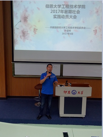 4月17日晚,yl6809永利官网集团学生暑期实践动员会在旧区和昌楼致知讲堂举行,院党总支书记兼副院长曾凤生、院党总支副书记吕思仁、院团委书记许淑琴、院学生会指导老师陈晓红、辅导员王茂伟等指导老师、2016级全体同学参加此活动。