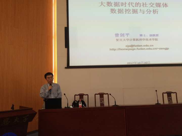 10月30日下午,yl6809永利官网集团邀请复旦大学曾剑平博士为我院师生举行关于“大数据时代的社交媒体数据挖掘与分析”的讲座。