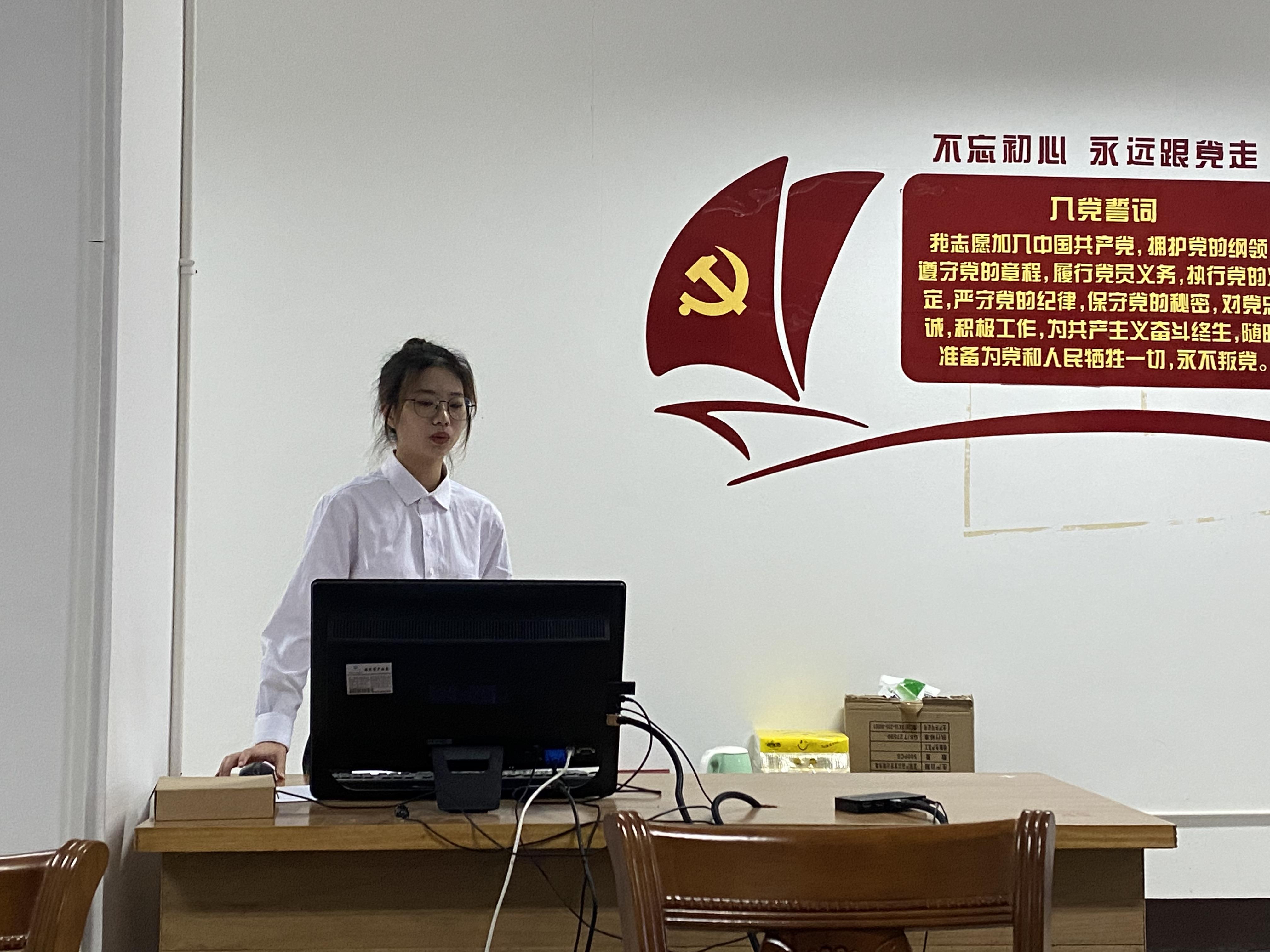 9名参加此次答辩的入党积极分子依次上台,从入党动机、个人思想、学习、工作和生活等方面进行阐述和汇报,同时也明确指出了自己仍需改进的不足之处。每位入党积极分子阐述个人情况后,提前抽取党史知识必答题进行回答,由主持人从题库中时政选答题现场作答,随后由答辩评审团的老师结合党的理论知识和具体案例随机对入党积极分子进行提问并打分。
