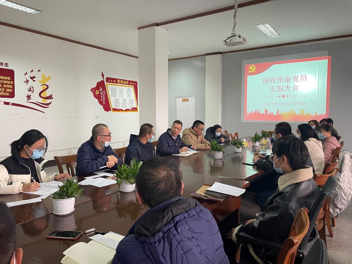 12月14日,教工党支部于泽钏楼四楼召开支部党员大会,讨论接收张志阳同志为预备党员的事宜。支部全体在校党员参加,到会人数符合会议要求。会议由教工党支部书记王波主持;学院党总支书记曾凤生出席会议。