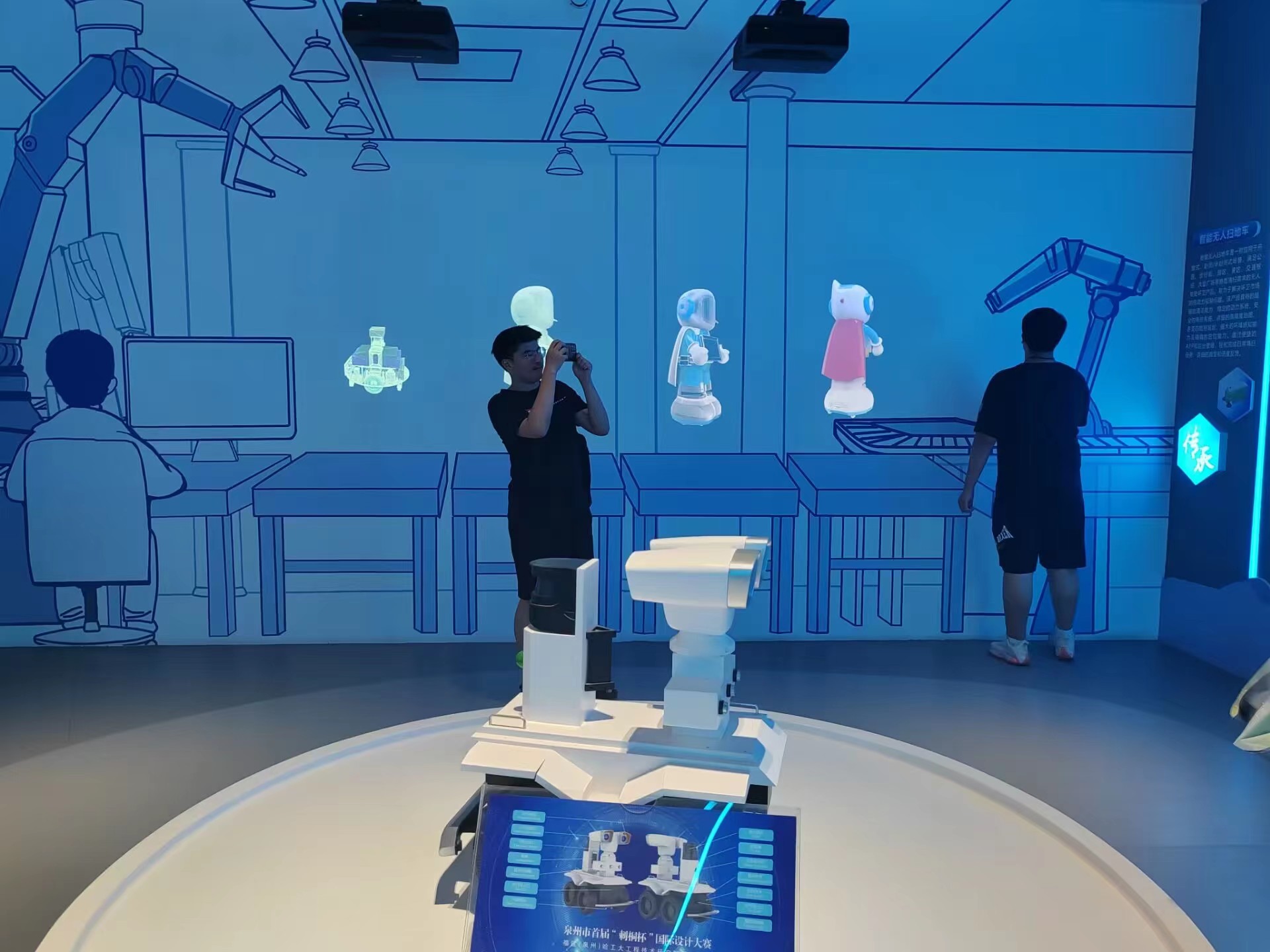 在泉州数字经济产业园,同学们先在工作人员的讲解下了解了泉州数字经济产业园的发展历程、入驻企业的经营领域、主要产品、从业人员等情况。随后,同学们分别到不同分展厅进行了解参观。
