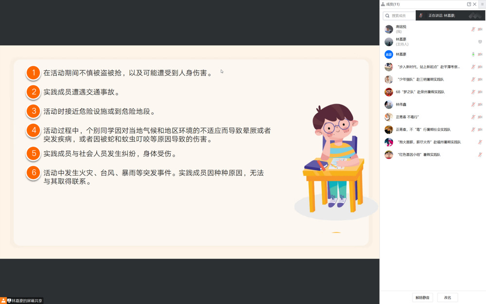 为贯彻落实学校团委对于暑期社会实践工作的要求,加强对暑期社会实践活动的指导,提高安全意识,夯实安全责任,确保2023年社会实践活动安全有序开展。2023年6月25日下午,网络工程系团总支在线上召开了2023年暑期社会实践安全教育大会。所有实践队队长参加会议,会议由网络工程系团总支书记林嘉豪老师主持。