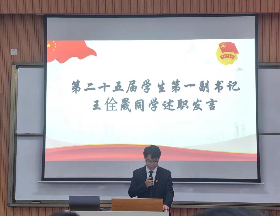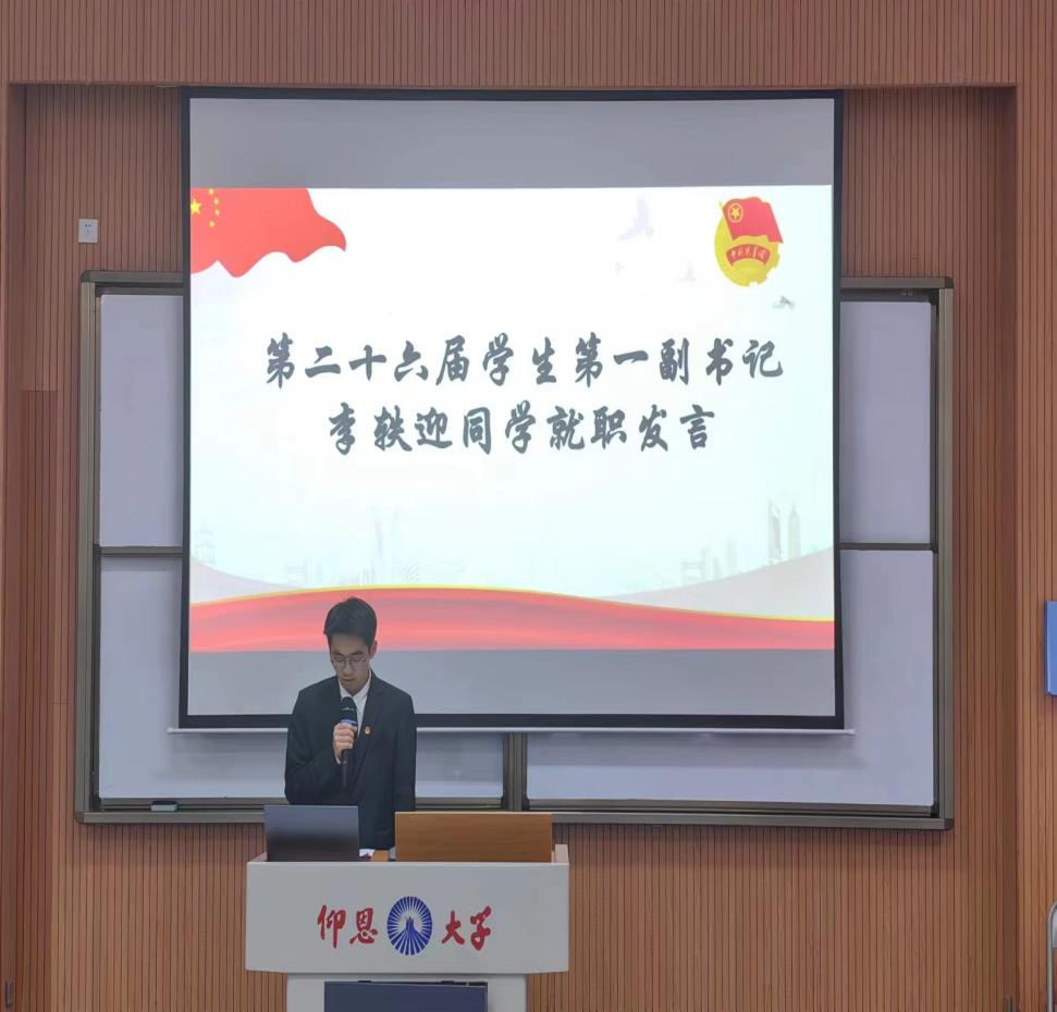 会上,第二十五届学生第一副书记王佺晟同学和第二十六届第一学生副书记李轶迎同学进行发言,分别进行述职和就职发言,对在团委任职期间的工作进行总结,也对今后工作提出了新的展望。接着,对团委这一年来在工作中认真负责的干部和书记颁发了奖状以表彰其突出贡献,并希望新一届干部干事们在今后的日子里为我院团委工作做出积极的贡献。