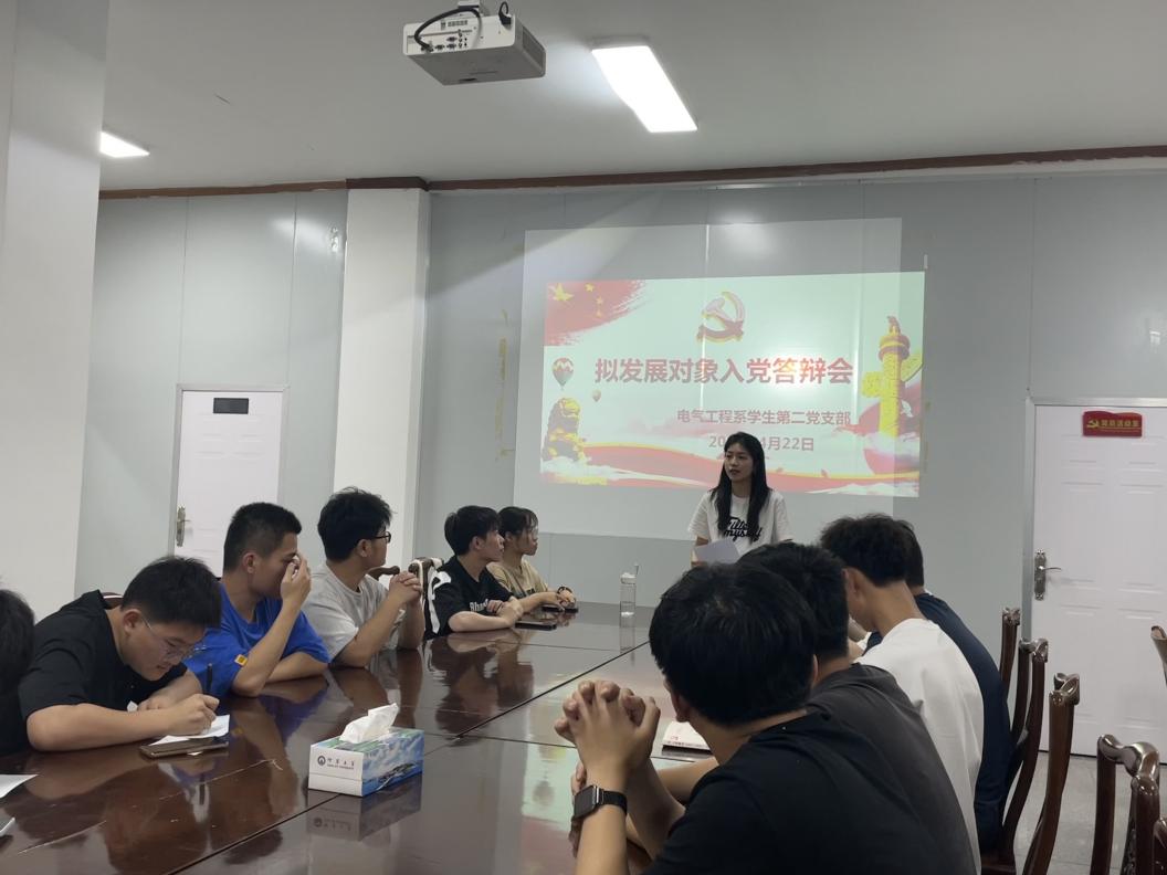 为推进党员工作发展,提升发展对象质量,yl6809永利官网集团电气工程系学生第二党支部于4月22日下午在第三教学区泽钏教学楼四楼会议室召开拟发展对象答辩会。会议由电气系学生第二党支部书记陈慧敏主持,支部全体党员和部分入党积极分子参加会议。