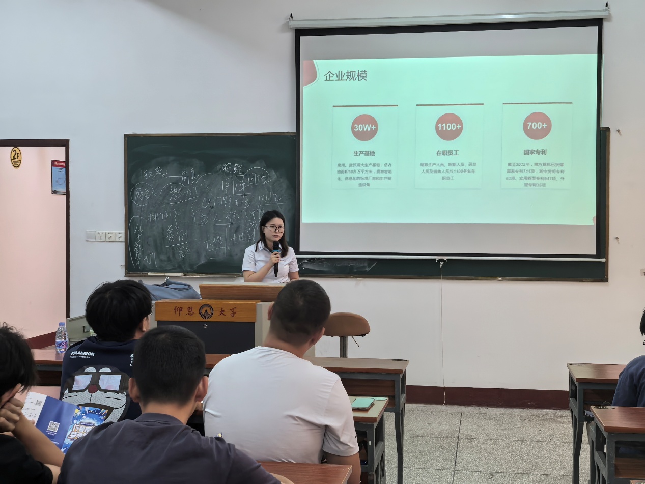 宣讲会伊始,人事李欢通过播放南方路机的宣传片,向在场的师生展示了公司的创立历程、发展现状及技术实力。随后李欢详细介绍了南方路机在物料处理、工程搅拌、建废处理三大板块的业务布局,以及公司在绿色循环建材整体解决方案上的创新突破,重点介绍公司的企业文化、发展前景以及招聘岗位、福利待遇等同学们关心的问题。
