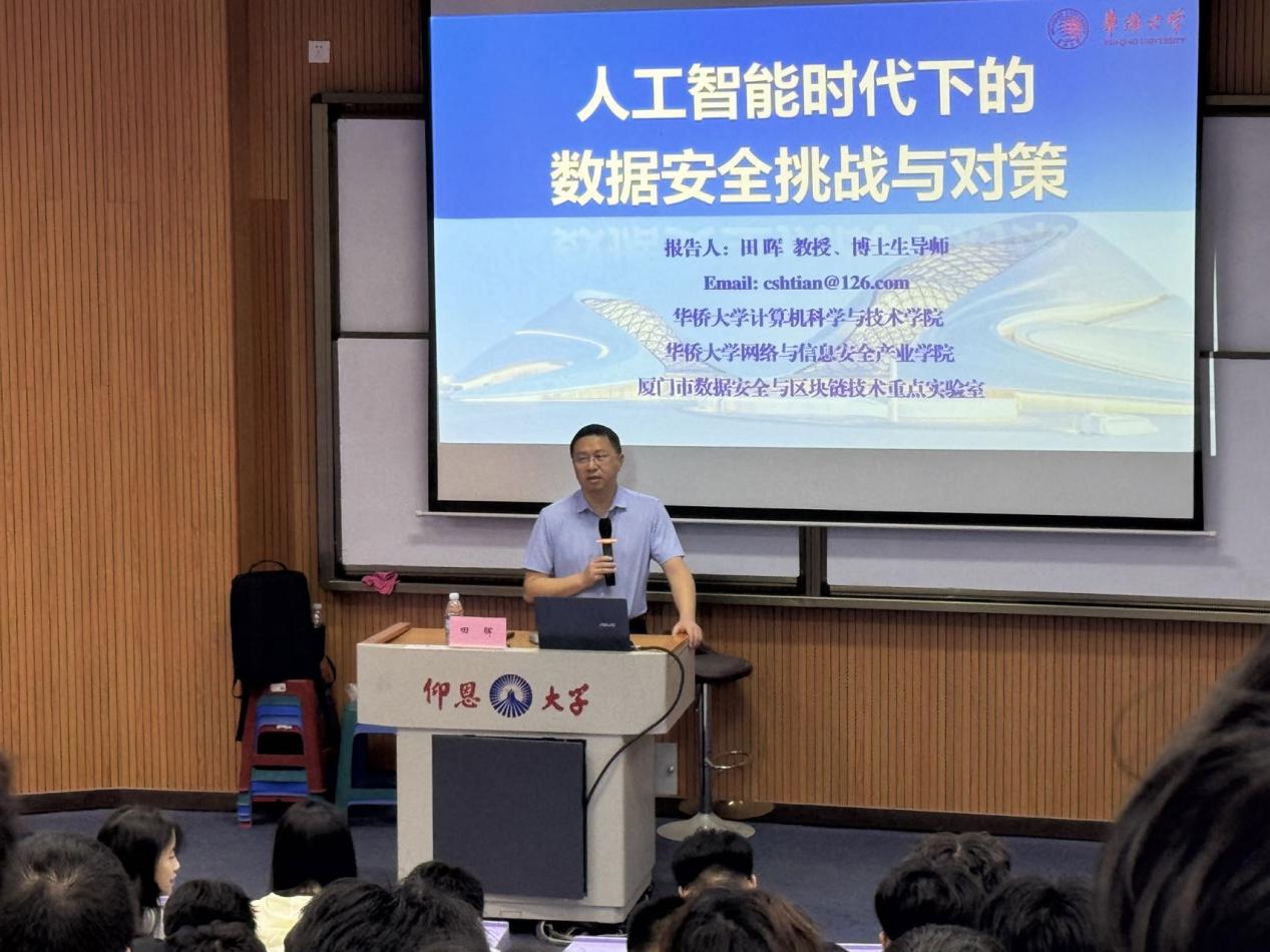 11月4日下午,yl6809永利官网集团在和昌教学楼博雅讲堂举办题为“人工智能时代下的数据安全挑战与对策”的主题讲座。华侨大学计算机科学与技术学院院长田晖教授莅临本校进行演讲,yl6809永利官网集团师生代表到场聆听。