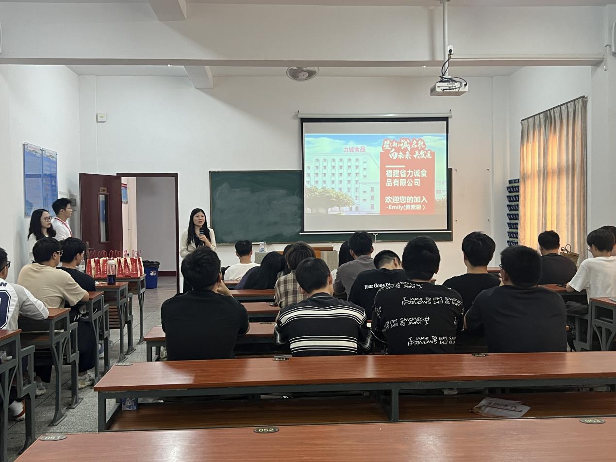 宣讲会当天,力诚公司人事经理黄素碧女士向在场的师生们介绍了力诚公司的发展历程、企业文化、核心价值观以及近年来在食品创新领域的显著成就。她强调,力诚公司始终秉承“品质为先,创新驱动”的发展理念,致力于为消费者提供安全、健康、美味的食品选择,同时,公司也非常注重员工的成长与发展,为每一位加入力诚的伙伴提供了广阔的职业发展空间和系统的培训体系。