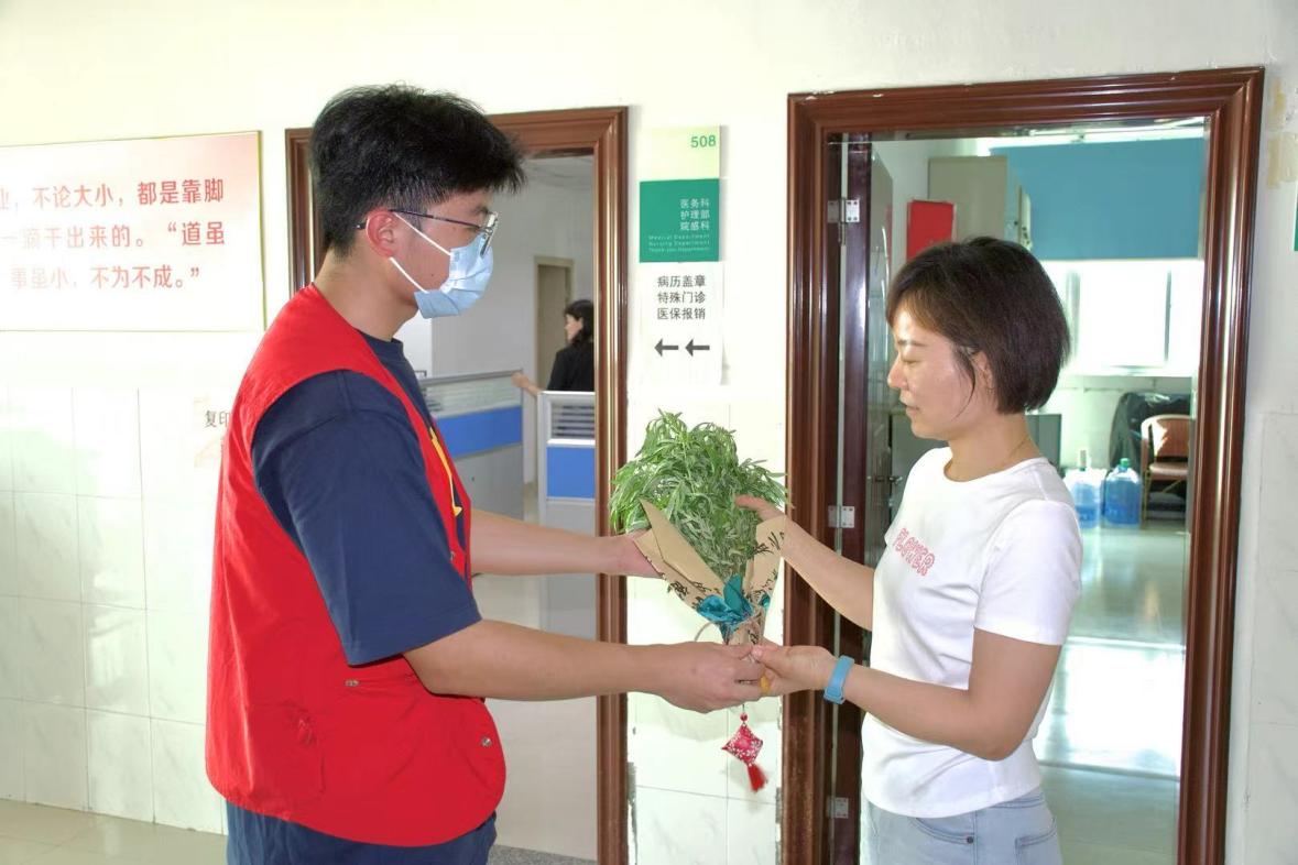 参加此次活动的同学们怀着满满的心意与热忱,提前精心筹备了祝福礼物。他们亲手制作了艾草香囊、艾叶花束等小礼物,还在明信片上用心书写祝福语,“艾叶青青,粽香悠悠,安康为愿,健康相守”,字里行间饱含着同学们对医护人员和患者的美好祝愿。艾叶花束与香囊制作完成后,党员和团员青年们带着满满的爱心前往洛江区马甲医院。在医院工作人员的带领下,大家首先来到了医护人员的办公区域,将粽子、艾叶花束、香囊和亲手书写的祝福卡片送到医护人员手中。医护人员们对大家的到来表示热烈欢迎和衷心感谢,他们纷纷表示,在这个忙碌的工作中,能感受到来自仰恩学子的关爱和支持,让他们倍感温暖和鼓舞。