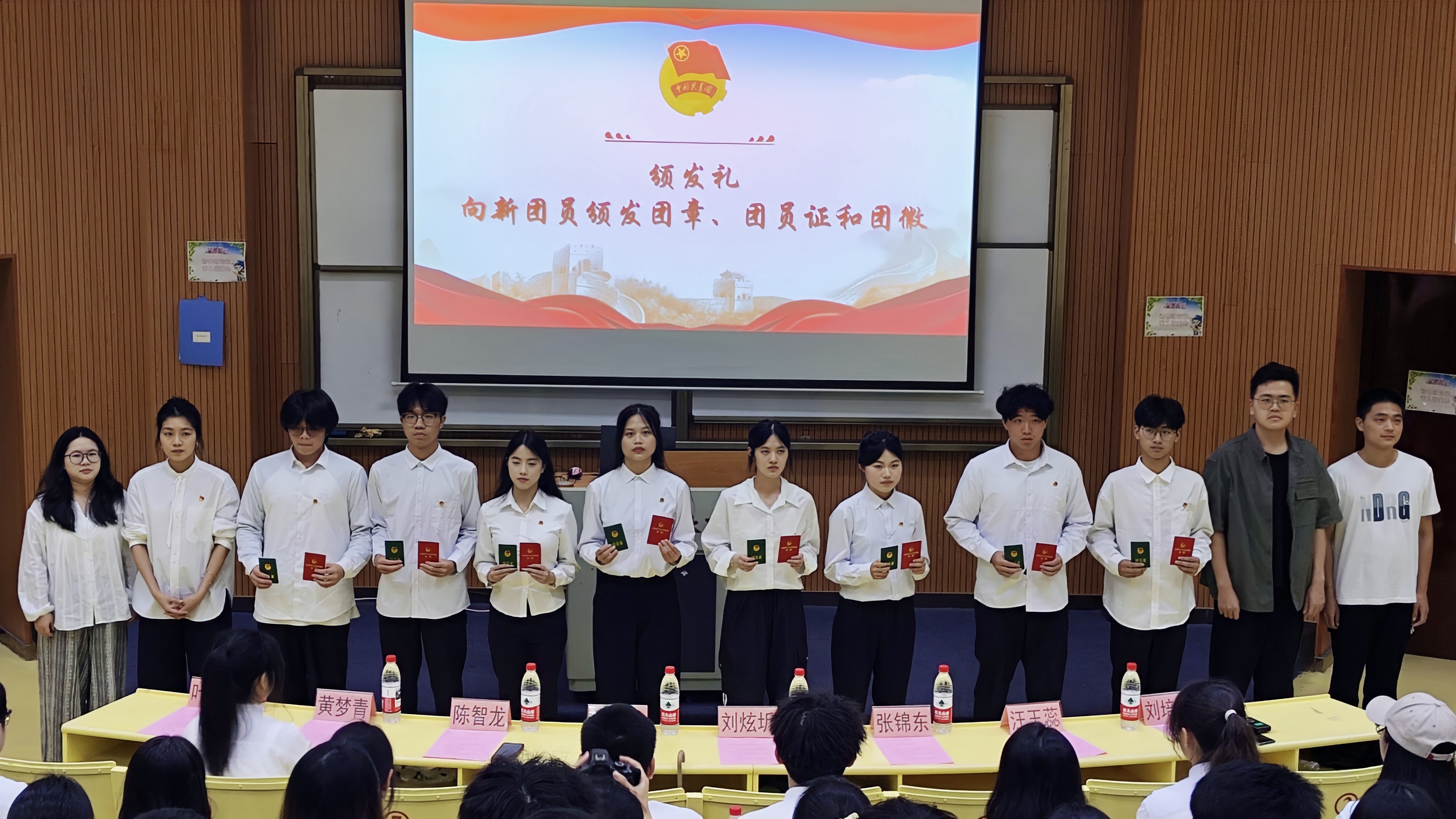 院团委叶嘉琪同学说明入团仪式的意义并宣读新团员名单。随后,院团委老师为新团员代表佩戴团徽和颁发团章、团员证。颁发礼后,在院团委刘培莹同学的带领下,全体新团员面向团旗庄严宣誓,老团员重温入团誓词。入团介绍人代表林晓婷宣读了《团章》中有关团员义务和权利的条款,帮助新团员明确使命。