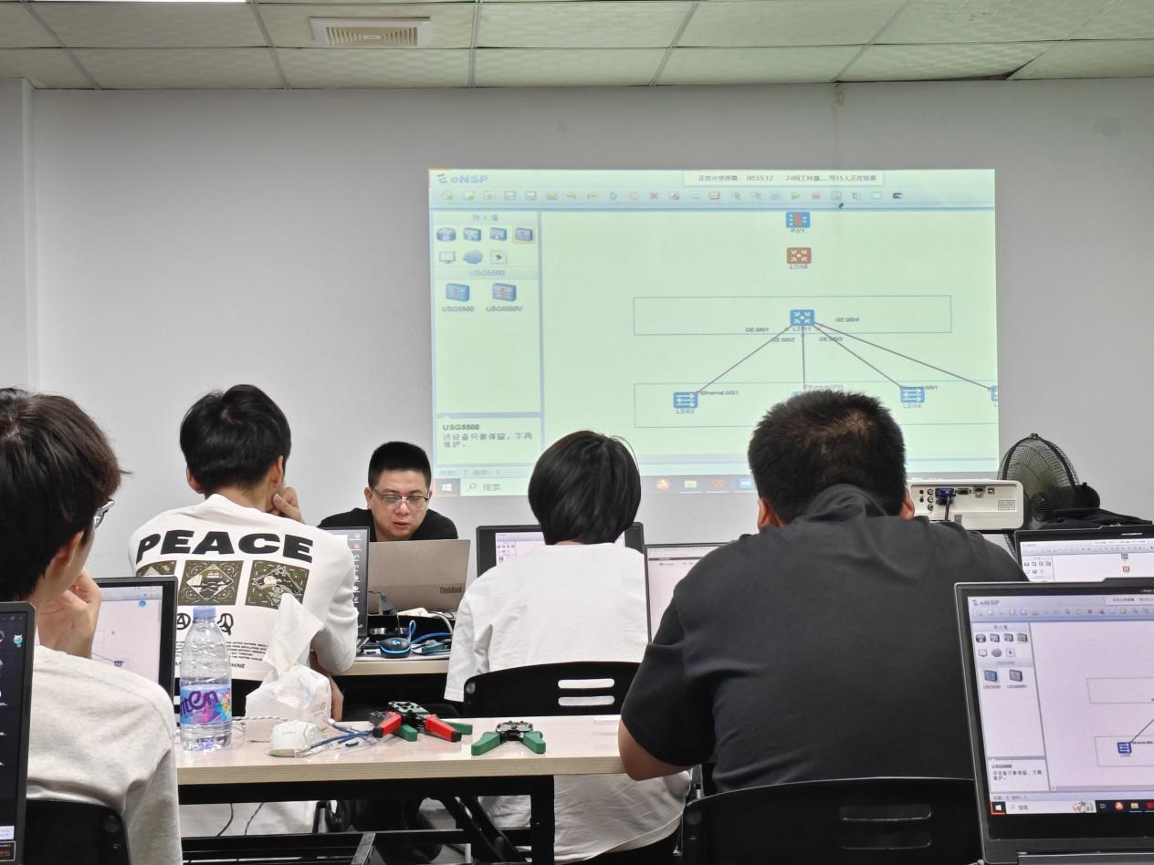 针对网络设计核心能力,企业导师指导学生通过eNSP软件完成从星型到混合拓扑的20余种架构设计。在虚拟组网环节,队员们完成12项基础命令的协同操作,实现跨楼层网络的实时数据互通。