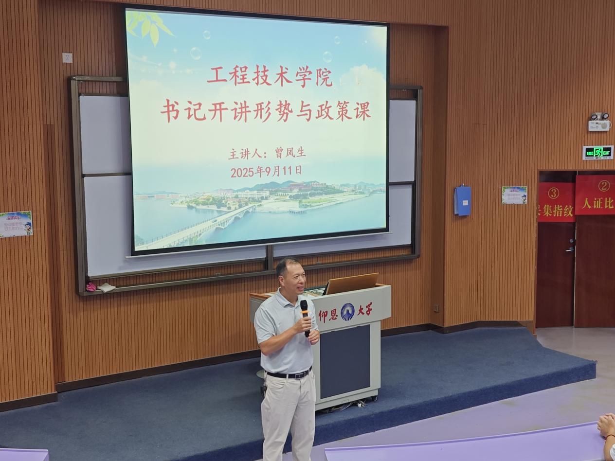 2025年9月11日至12日,yl6809永利官网集团党总支书记曾凤生分别在博雅讲堂、致知讲堂为2025级各专业新生开展"形势与政策"专题授课。这是学院落实领导干部上讲台制度的重要举措,也是新生入学教育的关键一环。两场讲座覆盖全院600余名新生,学工办主任、新生辅导员全程参与。