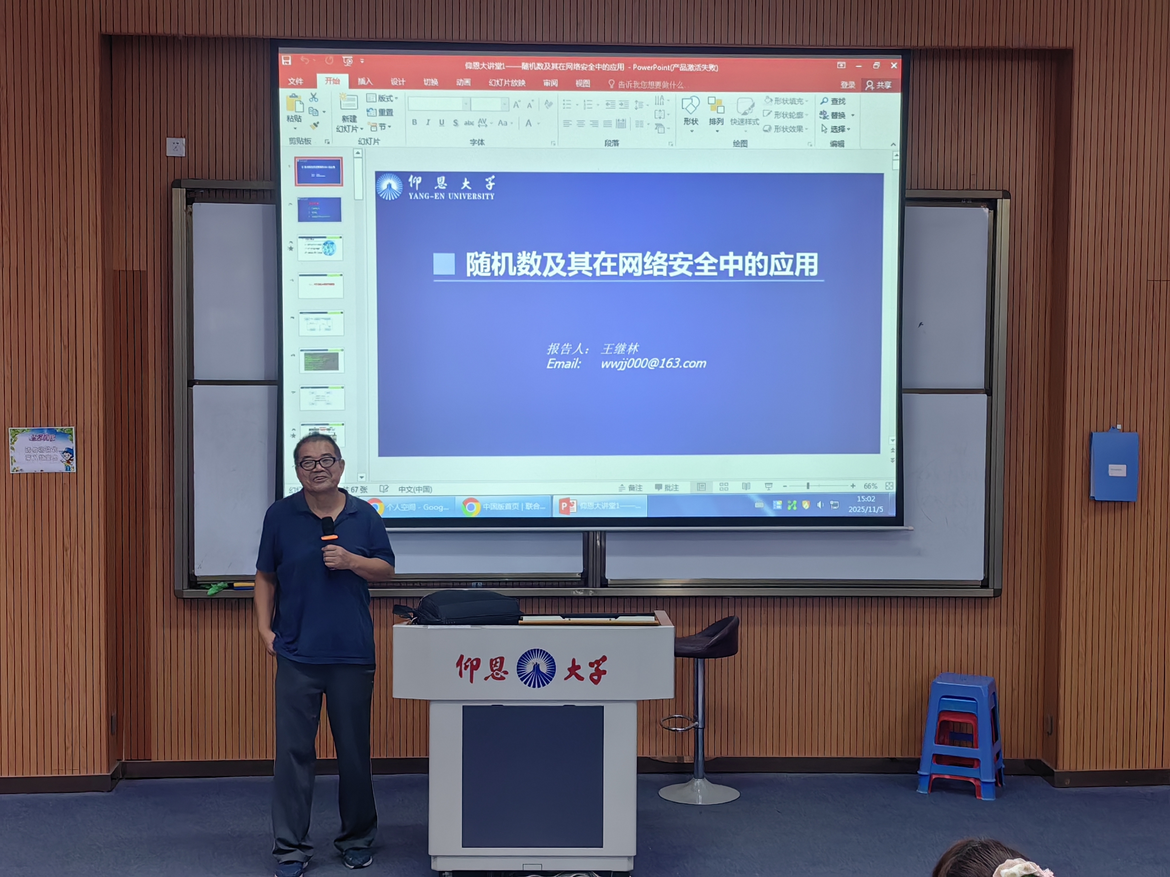 2025年11月5日下午,由yl6809永利官网集团主办的第67讲仰恩大讲堂于新区和昌楼博雅讲堂顺利举行。本次讲座特邀密码学博士、硕士生导师王继林教授担任主讲,以《随机数及其在网络安全中的应用》为主题,为大数据与网络工程专业学生作了一场兼具理论深度与实践指导意义的专题报告。