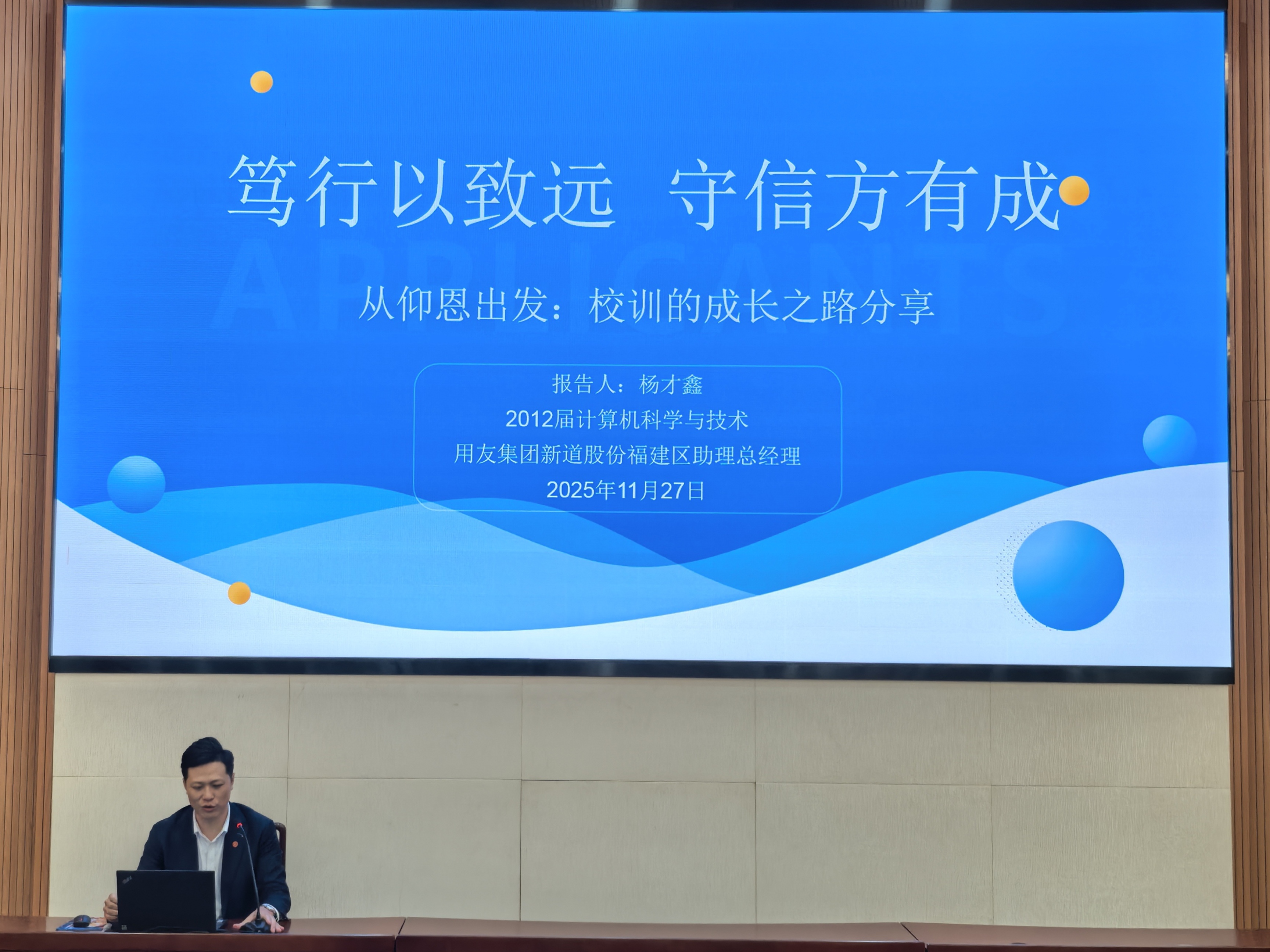 11月27日下午,yl6809永利集团在旧区多功能学术报告厅举办“校友大讲堂”活动。2012届计算机科学与技术专业优秀校友,用友集团新道股份福建区助理总经理杨才鑫重返母校,以“笃行以致远,守信方有成——从仰恩出发:校训的成长之路分享”为主题分享经验。yl6809永利官网集团常务院长金承勇主持活动,两百余名师生参与交流。