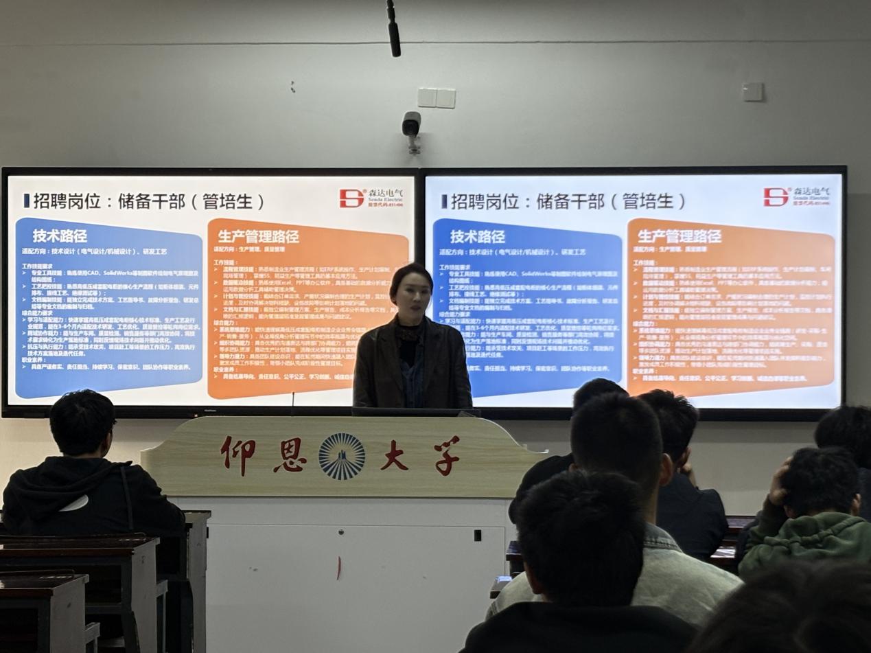 宣讲会伊始,人事经理向在场学生全面展示了公司的发展历程、行业地位及核心业务。福建森达电气股份有限公司硬件设施完善,客户群体分布广泛,具有良好的市场口碑。作为行业内的标杆企业,其实力雄厚且底蕴深厚。通过详细介绍,学生们对企业有了更直观、全面的了解。