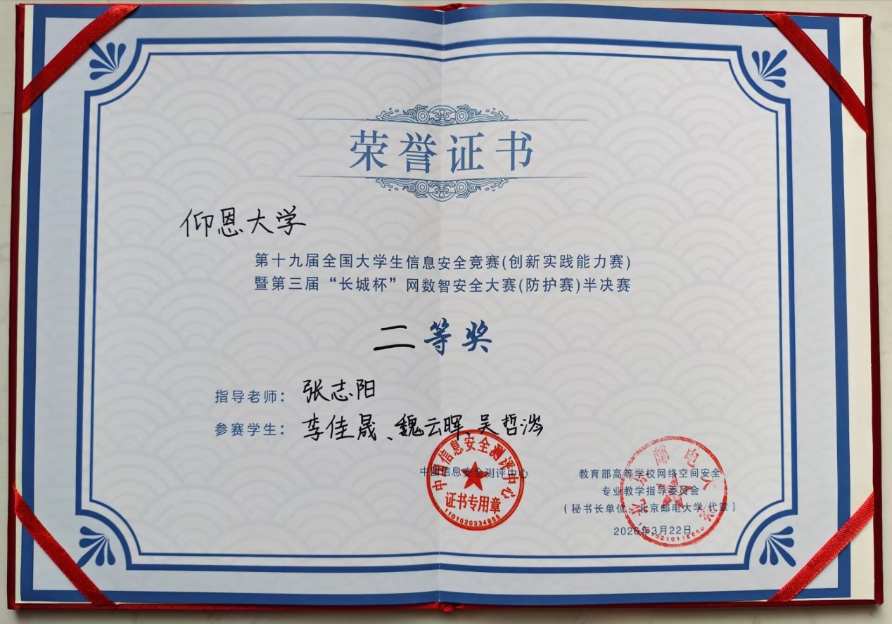 这份荣誉,为我校的信息安全教育和学子们的卓越表现提交了一份亮眼答卷。据悉,我校一直重视网络信息安全人才的培养,通过开设相关课程、举办相关比赛、讲座和实践活动、成立校级网络安全战队等方式,不断提升学生的网络空间安全意识和技能水平。近年来,我校网络安全战队在网络安全比赛中取得了多个国家级、省级等奖项,欢迎对网络安全感兴趣的同学加入战队。(yl6809永利官网集团 张志阳/文图)